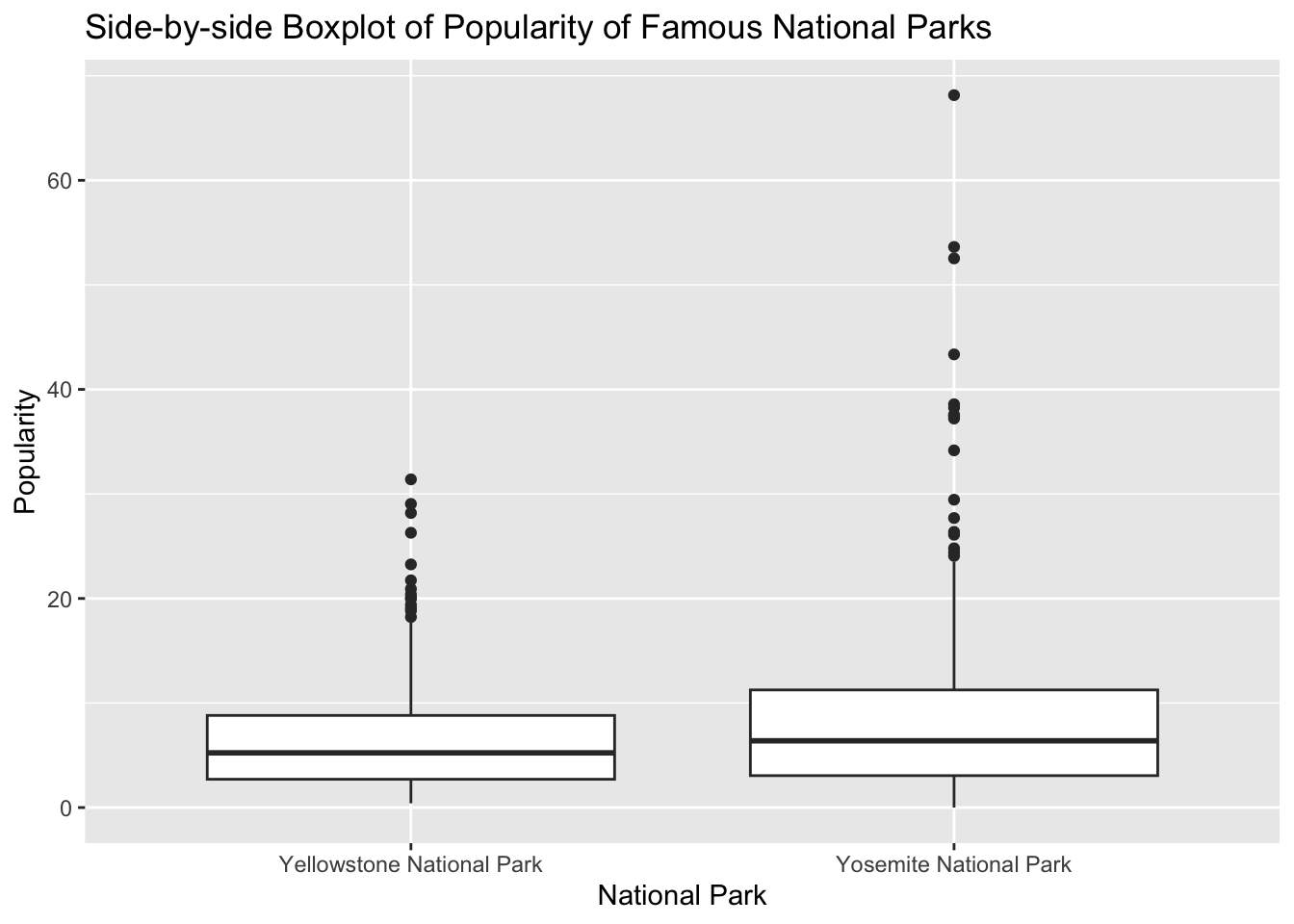 # Q9 statistical model codebetter_park <- national_park |>filter(area_name %in%c("Yosemite National Park", "Yellowstone National Park"))|>select(area_name, avg_rating, popularity)t_test_rating_result <-t.test(avg_rating ~ area_name, data = better_park)t_test_popularity_result <-t.test(popularity ~ area_name, data = better_park)print(t_test_rating_result)