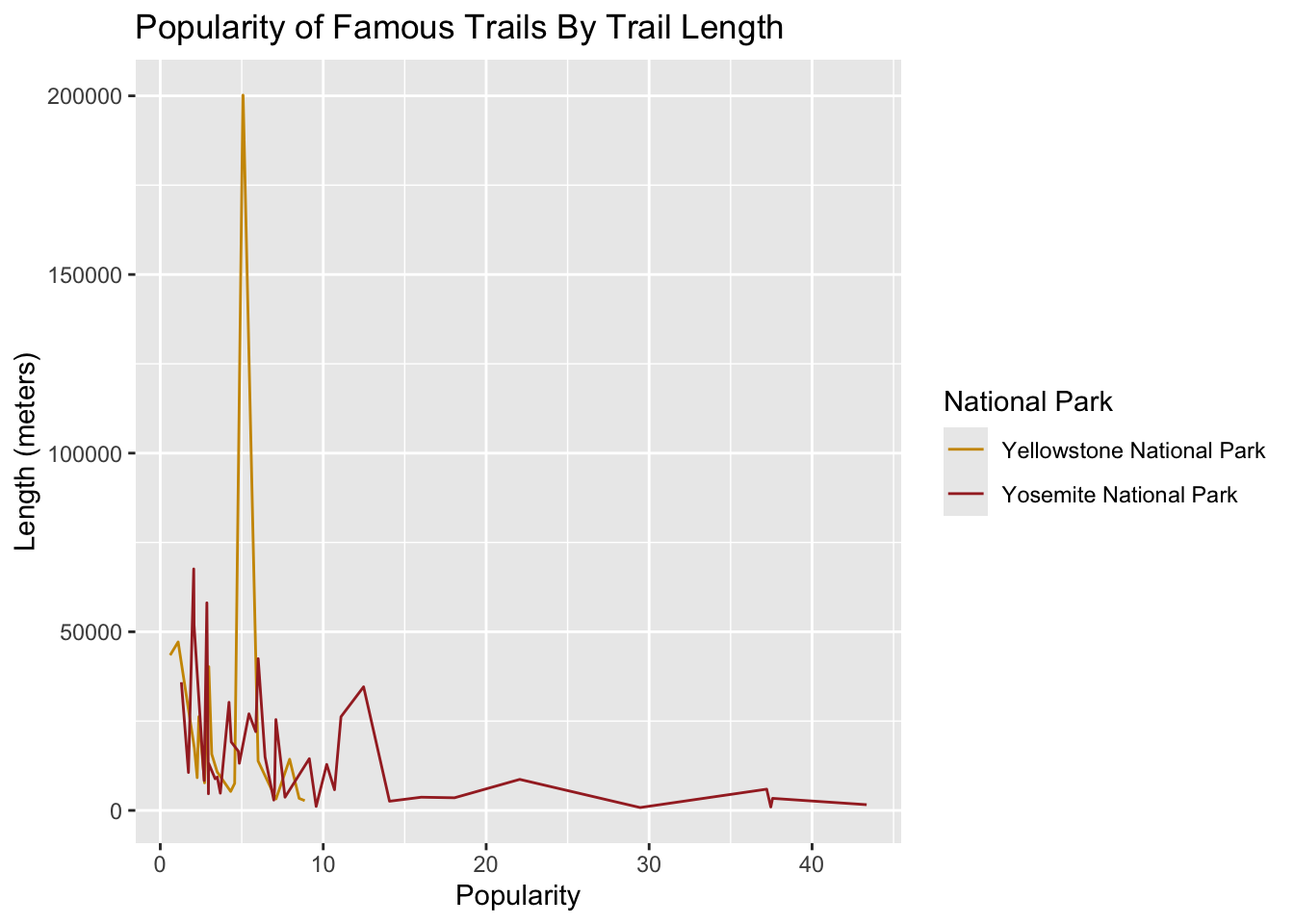 national_park |>filter(area_name %in%c("Yosemite National Park", "Yellowstone National Park"), avg_rating >3, !str_detect(features, "'dogs-no'"))|>ggplot(aes(x=popularity, y=length, color=area_name))+geom_line()+labs(x ="Popularity", y="Length (meters)", title ="Popularity of Famous Trails By Trail Length", color="National Park")+scale_color_manual(values =c("Yosemite National Park"="brown", "Yellowstone National Park"="#CD9600"))